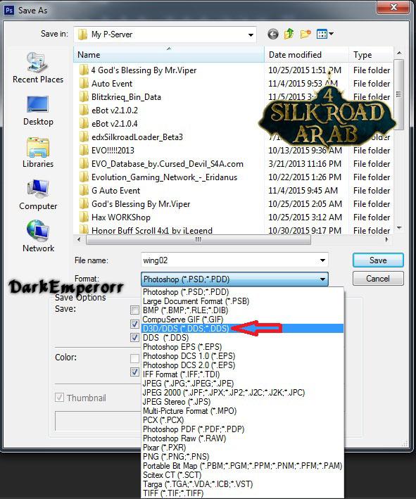 بسم الله الرحمن الرحيم أنا هشرح النهاردة إزاى تغير ألوان الجناح الخاص بالـ GodBless طبعا ً فى ناس ممكن تكون عارفة الموضوع ده بس أنا ملقتش الموضوع هنا فى المنتدى فـ قولت أفيد بيه الناس أنا الـ Wings كانت عندى باللون الأبيض دلوقتى أنا غيرتها وبقت بالمنظر ده .. إسمعلاوى بقى وكده ^^ http://www11.0zz0.com/2015/11/07/02/851034747.jpg نبدأ الشرح ^^ ً أولا ً : البرامج المستخدمة فى الشرح DDS and DDJ Converter ( البرنامج ده بيحول الملف من DDS لـ DDJ علشان تعدل عليه بالفوتوشوب والعكس ) PK2Tools ( طبعا ً البرنامج ده الـ Editor و الـ Extractor وده غنى عن التعريف ) PhotoShop ( وده طبعا ً صعب أرفعه فـ إنت ممكن تنزلوا من أى مكان ) PhotoShop Plugin ( الإداة بتتصطب عادى زى أى برنامج بتنزله ودى بتضيفها فى الفوتوشوب علشان تعرف تعمل Save بصيغة DDS اللى هو الملف اللى هتعدل عليه ) ثانيا ً : الشرح أول خطوة هنستخرج الملف اللى هنعدل عليه من المسار ده Particles/textures ونختار الملف اللى بالإسم ده wing02.ddj http://www11.0zz0.com/2015/11/07/02/982930322.jpg تانى خطوة هتفتح البرنامج ده DDS and DDJ Converter وهتعمل زى اللى فى الصورة http://www11.0zz0.com/2015/11/07/02/344788966.jpg ثالث خطوة بعد مـ حولنا الملف من DDS لـ DDJ علشان نعرف نعدل عليه بالفوتوشوب هتفتح الفوتوشوب وتفتح الملف من المسار بتاعه اللى قولناه قبل كده وهتبقى بالمنظر ده http://www6.0zz0.com/2015/11/07/02/250155222.jpg دلوقتى الجناح جاهز للتعديل عليه هتنزل الصورة أو العلم اللى إنت عايز تضيفه بعد ما نزلت العلم هتظبط مقاس العلم على مقاس الجناح بالظبط بالظبط زى الصورة http://www6.0zz0.com/2015/11/07/02/793824320.jpg بعد كده هتروح على المربع اللى على اليمين وهتفتح القائمة دى http://www6.0zz0.com/2015/11/07/02/369440796.jpg هتبقى بالشكل ده http://www10.0zz0.com/2015/11/07/02/561571237.jpg هتجرب خيار .. خيار لحد ما تلاقى الشكل اللى إنت عايزه أنا بالنسبة ليا إخترت الخيار ده http://www10.0zz0.com/2015/11/07/02/613921478.jpg الخطورة دى مهمة أوى هى واللى بعدها بعد طبعا ً مـ خلصت تعديل وعملت الشكل اللى إنت عايزه عايز تعمل Save دلوقتى جه وقت الـ Photoshop Plugin اللى إحنا نزلناه هتختار زى الصورة وتعمل Save http://www10.0zz0.com/2015/11/07/02/392134831.jpg ركز هنا بعد ما حضرتك دوست Save هتطلعلك صفحة تانية زى اللى فى الصورة هتعمل زى اللى موجود فى الصورة وتدوس Save http://www8.0zz0.com/2015/11/07/02/114241892.jpg طيب عايزين نرجع بقى الملف زى ما كان هتعمل زى اللى فى الصورة بالظبط http://www8.0zz0.com/2015/11/07/02/700757717.jpg وتيجى بقى أخر خطورة هتعمل Import للفولدر عادى جدا زى الصورة http://www8.0zz0.com/2015/11/07/02/671089115.jpg لو مشيت على الخطوات دى بالظبط ساعتها أقدر أقولك مبروك عليك ملحوظة : الجناح الشمال بيبقى زيه بالظبط يعنى بيبقى عكس الجناح اليمين مثال : لو عملت الجناح كده > هتلاقى الجناح الشمال كده < يعنى هيبقى كده >< ملحوظة : لو إنت بتعرف تشتغل على الفوتوشوب هيبقى الموضوع سهل بالنسبالك ملحوظة : مش عايز حد يجى يقولى منقول أو قديم متقولش منقول علشان ده من مجهودى الخاص والصور وكل حاجة من على جهازى ومتقولش قديم علشان لو قديم وإنت عارفه من زمان كنت عملت موضوع بيه هنا تفيد بيه الناس |