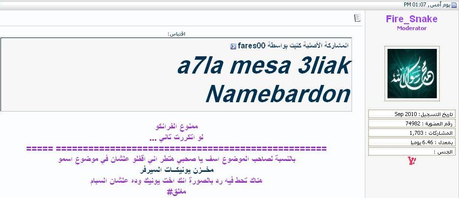 حضرتك قولت ان اشرافك كان بعد يوم 7/6/2011 والصورة اللى انا حطيتها لحضرتك دى لما الناس كانت بتباركلك على الاشراف الصورة دى بتاريخ 6/6/2011 يعنى انت كنت مشرف يوم 7/6/2011 مش زى ما قولت انا مكنتش مشرف لسه واقولهالك تانى يا تقول كلام فى محلو يا تقول حلو يا حلو وانا مش بتكسف ولا الناس كسفتنى انت اللى بتكسف نفسك وانت بترد على حاجة تانية انا ولا جبت سيرة يونكات ولا حظاظات وعلى فكرة فى مثل بيقولك اللى يتكسف من بنت خالته ميجبش منها عيال ولامؤخذة فى الكلمة الدنيا علمتنى متكسفش من حد ولا بحرج من حاجة كتير عليك تقريبآ كده خد وقتك وزيادة كام كيلو سلاحف بقى اشوفك امس |