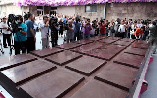 وقال مصنع "سويت وييف" إن القالب مزين بمايقرب من 14 ألف و600 قطعة شيكولاتة سوداء وبيضاء وقد استغرق تنفيذه 100 ساعة من العمل المتواصل. وقال نبيل ضامن عزيز مدير المصنع إن "القالب أشبه بلوحة فيسفساء ضخمة اذ تم تزيينه بقوالب شوكولاتة بيضاء تحمل صوراً لقادة الإمارات، وصوراً للانجازات العمرانية والتنموية العملاقة التي تشهدها الدولة". وأضاف: "يتم عرض القالب حالياً في القرية العالمية بدبي ومن المقرر أن يعرض في مواقع سياحية وفنادق كبرى بالإمارات ليعرض أمام أبناء الدولة والمقيمين والسائحين"، طبقاً لما ورد بجريدة "القدس العربي". وأشار إلى أن ادارة المصنع اللبنانية رأت تصنيع هذا القالب العملاق، كنوع من رد الجميل لدولة الإمارات، التي يعمل فيها هذا المصنع منذ اكثر من 17 عاماً. وكشف أن عدد قطع الشوكولاتة المزين بها القالب تمثل مجموع أيام 40 عاماً، هى عمر اتحاد دولة الإمارات، الذي يتم الاحتفال به هذا الشهر. ومن جانبها، أكدت امال الشعشاع التي أشرفت على تنفيذ القالب أن أكثر من 20 من الطهاة من جنسيات مختلفة تولوا تصنيع القالب القابل للأكل على مدار 4 أيام دون توقف. وأضافت أن موسوعة "جينس" للأرقام القياسية، تجري بحثاً حالياً حول القالب، تمهيداً لتسجيله في الموسوعة خلال أيام. |