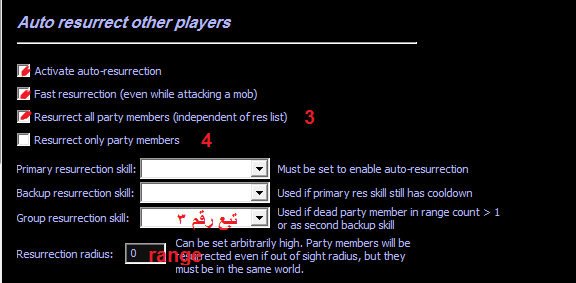 انت لو اوروبى وماسك وزيرد وبردو يعنى ماسك سلاحين وبتلعب بكليريك لازم تعلم على دى .. بالشكل ده http://www14.0zz0.com/2012/01/21/10/251444802.jpg لو مش اوروبى وبتلعب صينى فورس خلاص ,, لو اوروبى هاتمسك سلاحك فى المربع الاحمر وتحط الكليريك فى المربع الاصفر http://www14.0zz0.com/2012/01/21/10/341017499.jpg الخطوه التانيه انك تروح صفحة partyوتعلم على دول http://www4.0zz0.com/2016/12/29/03/244347773.png ال range براحتك ممكن يبقى 20 او 30 او 40 ممكن يبقى 1000 انا عامله 99999 عشان لو حد مات بعيد عن البارتى يروح يصحيه .. ال range ده بيحدد المسافه الى لو مات فيها حد من البارتى الشخصيه دى روح تصحيه ومكان كلمة reverse immolation تحط سكيل الريس بتاعك .. حسب بقى انت لفل كام وصينى ولا اوروبى . 3 - لو كذا واحد فى البارتى مات يعمل ريس .. و تحت تختار الريس الجماعيه 4- ديه يعنى يعمل ريس للبارتى بتاعتك بس بعد كده هاتروح صفحة البارتى وتعلم على اسم الشخصيه الى عايز تصحيها او تعملها اوتو ريس .. خلى بالك من المربع الاصفر http://www14.0zz0.com/2012/01/21/10/704969654.jpg وتضغط بالماوس كليك يمين على اسم الشخص الى عايز تعمله اوتو ريس وتختار auto res http://www14.0zz0.com/2012/01/21/10/235081216.jpg هتلاقى المربع الاصفر ظهر فيه علامة x وكده هو اشتغل http://www14.0zz0.com/2012/01/21/10/568707198.jpg تدوس بقى save setting لو عملت كل حاجه صح والشخصيه ماتت .. هايروح يصحيها زى كده http://www14.0zz0.com/2012/01/21/10/492105113.jpg ازاى تعمل accept للريس ( ازاى تقبل ريس ) اول حاجه هاتروح صفحة extra http://www14.0zz0.com/2012/01/21/10/752082431.jpg لو عايز البوت يقبل الريس ويشغل البوت تانى يضرب وكده .. علم على المتعلم عليها ,, ( يعنى ثانى اختيار ) لو عايز البوت يقبل الريس ويقف ( لو بتعمل dlvl يعنى ) علم على اول اختيار من فوق apply list مش شغاله فامش لازم تعلم عليها مش بتعمل حاجه اما تختار .. اضغط على save setting http://www14.0zz0.com/2012/01/21/10/135983371.jpg تم بحمد الله تم شرح بواسطة Solitary |