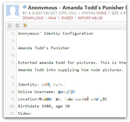 مراهقة كندية تنتحر بعد نشر صور عارية لها على الفيسبوك ومجموعة انونيموس تكشف هوية المجرم http://2.bp.blogspot.com/-pjm6nCbKsK...0/anon-dox.jpg http://2.bp.blogspot.com/-0UM_5wPy7w...manda-todd.jpg قصة اماندا صدمت العالم ، والعديد من الصحف تتبع الخبر عن كثب ، فيما الدرس الذي لقنته اماندا الى جميع الاباء انه يجب عليهم التفكير مرتين قبل ان يسمحوا لابنائهم المراهقين من أن يمتلكوا حسابات دردشة على الانترنت ، بل وضرورة المراقبة الصارمة ، تفاديا لأي مشاكل يمكن ان يضع الاهل او الابناء في أزمات حقيقية . http://3.bp.blogspot.com/-DqHoQy1Sej...320/raghib.png اذا سمعت بقصة اماندا تود او لم تسمع بها فإليكا تلخيص لمجريات القصة مراهقة تبلغ من العمر 15 سنة تقطن ب ميناء كوكتلام كولومبيا البريطانية ، تعرضت الى مضايقات كثيرة من طرف زملائها بعدما نشرت صور صدرها العاري في احدى صفحات الفيسبوك والتي كانت تحمل اسمها + الصور ، هذا ماكشفت عنه أماندا من خلال فيديو لها على الانترنت تحكي فيه قصة الصور وكيف كان لشاب يكبرها في السن ان يهددها بنشر صورها العارية في حالة اذا لم تلبي رغبته بمواعدة خاصة محولاحياتها الى جحيم . الشخص المجهول والذي قام بنشر الصور على صفحة في الفيسبوك جعل المراهقة الصغيرة أضحوكة اصدقائها في الإعدادية التي تدرس بها بعد ان قاموا بدعوتها الى تلك الصفحة وشاهدت صورها الخاصة ، وكان ذلك بداية للعديد من المضايقات التي شهدتها الفتاة مما ادى الى تأزم وضعيتها النفسية يوما بعد يوم . مما جعلها تفكر في تغير المدرسة التي تدرس بها وتدمن على المخدرات والكحول ، إلا ان ذلك لم يكن الحل حيث واصل "البلطجية" مضايقتها خصوصا بعد عراك آخر مع فتاة جعلها تحاول الانتحار عبر شرب مادة سامة اماندا نشرت فيديو على اليوتوب تحكي فيه حكايتها مع البلطجية وكيف تغيرت حياتها بسبب تلك الصور . الفيديو الذي نشر على اليوتوب في سبتمبر شهد مايفوق 4 ملاين مشاهدة ، لكي تنتحر الفتاة اسبوع قبل عيد ميلادها 16 عشر في 10 اكتوبر 2012 مجموعة انونيموس كان لها ان تتدخل لفك ملابسات هذه القضية ، حيث إستطاعت المجموعة البارحة من معرفة هوية الشخص الذي قاد المراهقة الصغيرة الى الانتحار ، وهو حسب منشور نشرته مجموعة انونيموس على موقع "باست بين" وكذلك فيديو على اليوتوب تبين فيه هوية الشخص المصدر |