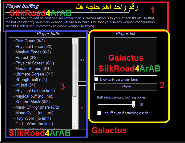 1- لازم تكون حطيت على الاقل 1 skill من ال فى ال skill list على شان البوت يقدر يعرف نوع ال weapon ال انت بتعمل بي buff 2-لو انت فى pt دوس على refresh هيظهر اسماء الناس ال معاك فى البارتى 3-لو انت warrior مثال .. هتنزل buff ال warrior ب ال لون الاحمر و باقى ال builds نفس الموضوع و كل buff مكتوب عليها انت ممكن كام واحد ياخده و .فى buff مكتوب عليها no Limit ديه يعنى ممكن البارتى كلها تاخدها لو انت warrior / warlock و عايز تدى buff warrior و scream mask warlock لازم تكون عامل activate weapon switch فى ال skill list |