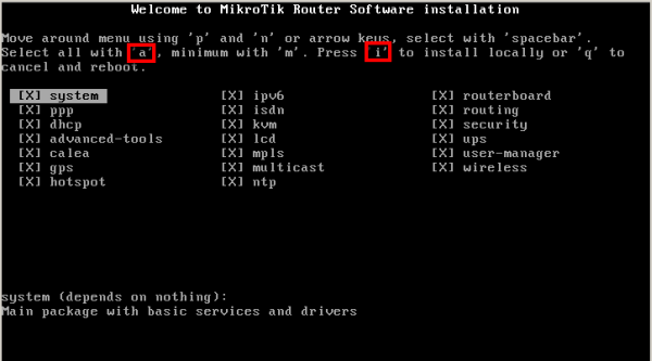 نقوم بعد ذلك بتحديد كل الاختيارات من خلال الضغط على زر a فى لوحة المفاتيح لانها المرة الاولي التي نقوم فيها بتثبيت نسخة المايكروتك.